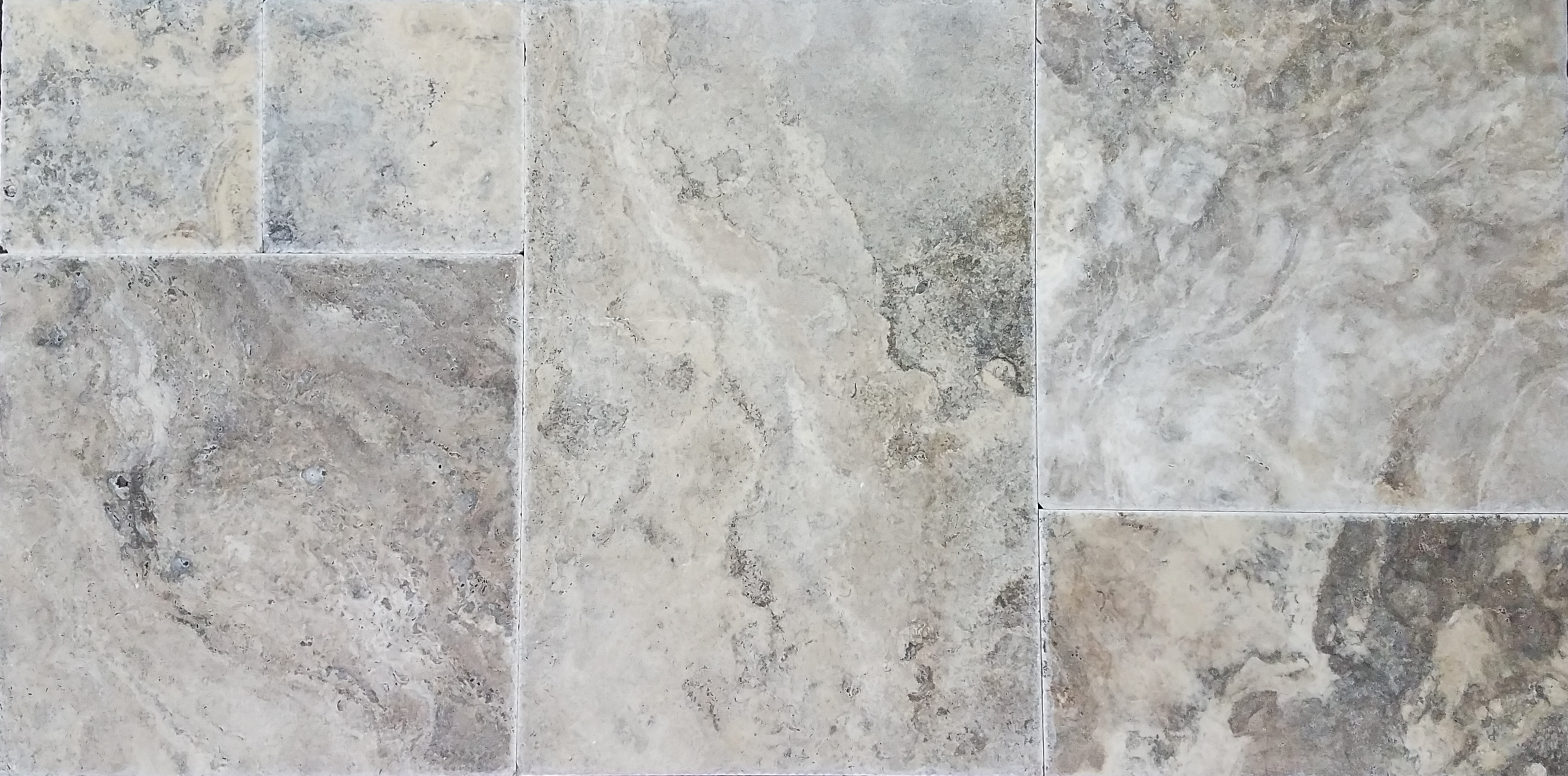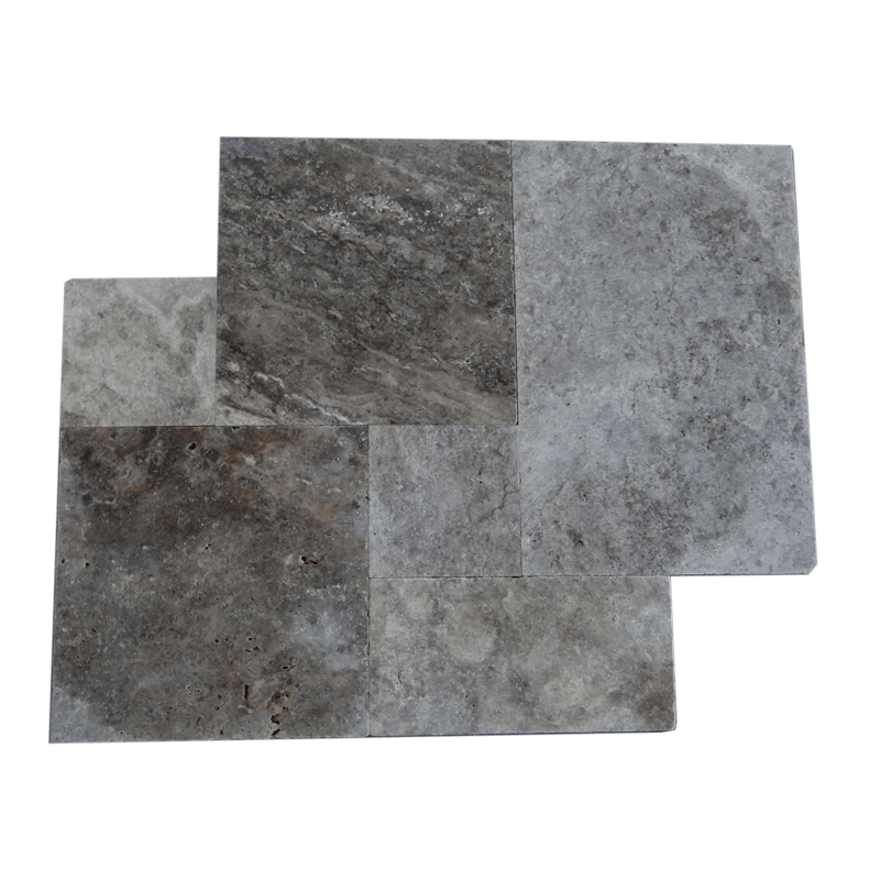 Silver French Pattern Tile Material: Travertine Surface & Finish: Unfilled & Brushed Edge: Chiseled
